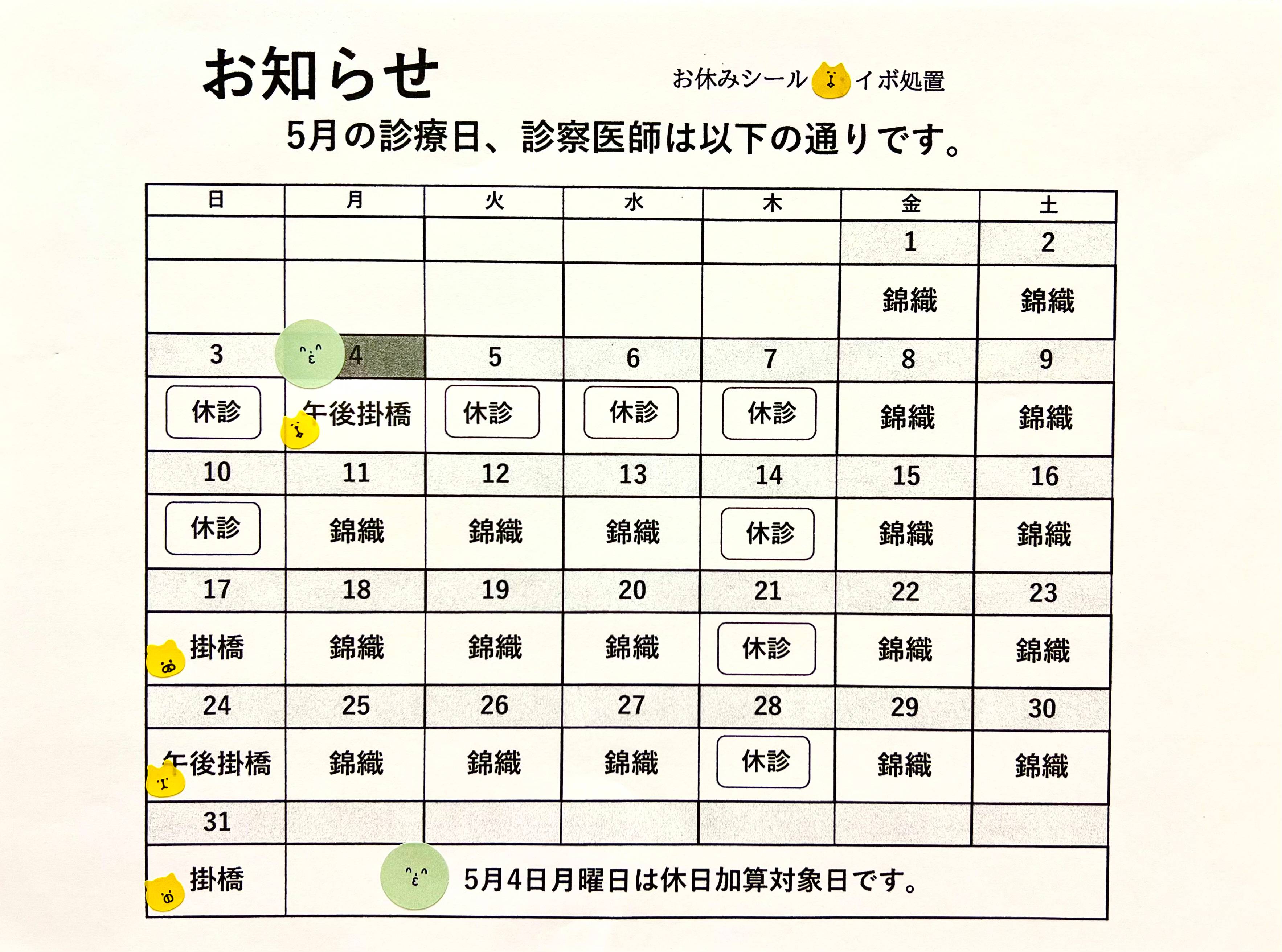 5月診療のお知らせ