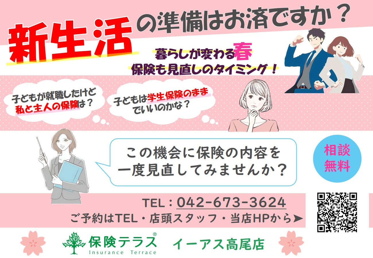 こんにちは。 保険テラスです。 春めいてきた今日この頃ですが、皆様いかがお過ごしでしょうか? この春、保険テラスでゆっくりと保障内容の確認などしてみてはいかがでしょうか。 スタッフ一同、お待ちしております。
