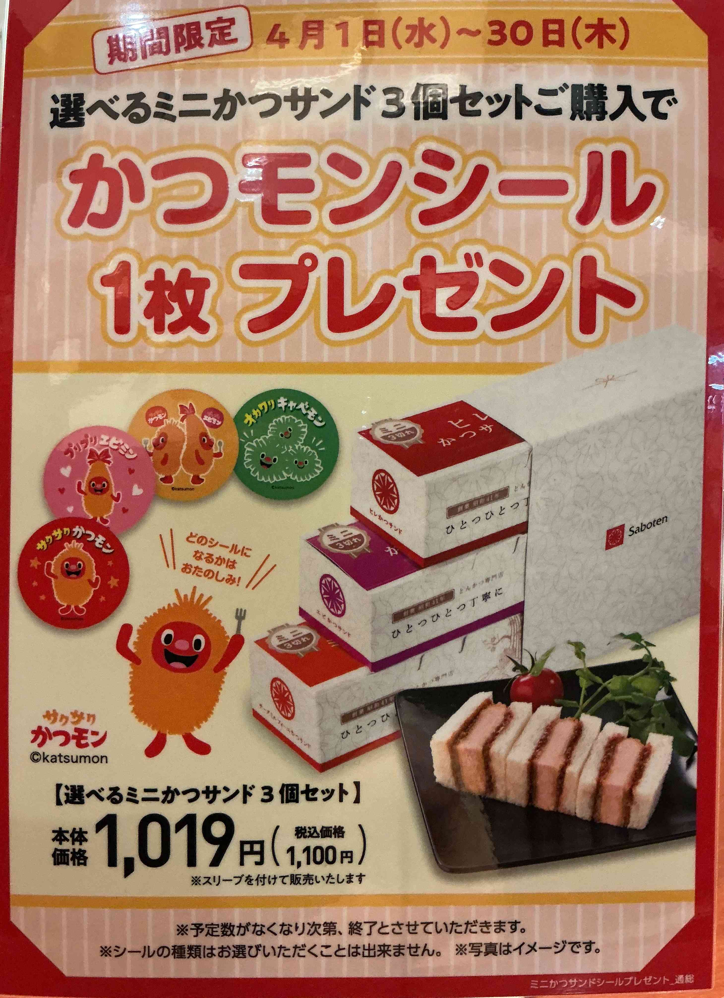 さぼてんのミニかつサンドは今だけ3個お買い上でかつモンのオリジナルシールをプレゼント♪